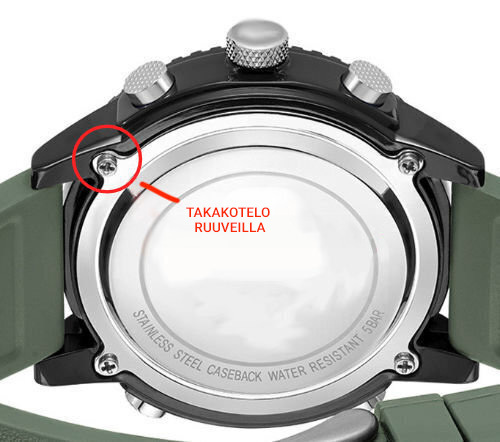 Voit avata takakotelon ilman ruuveja etsimällä kannen sivussa olevan pienen harjanteen. Sitä voi olla vaikea löytää, mutta se löytyy kaikista kelloista, joissa on tämäntyyppinen kotelon takaosa. Kun olet löytänyt kohouman, avaa kansi varovasti saappaanavaajalla. Jos et ole varovainen, vaarana on, että kellon tiiviste vaurioituu, mikä puolestaan johtaa vedenkestävyyden heikkenemiseen. Muista myös takakannen suunta ennen sen poistamista.