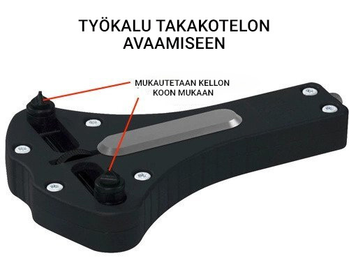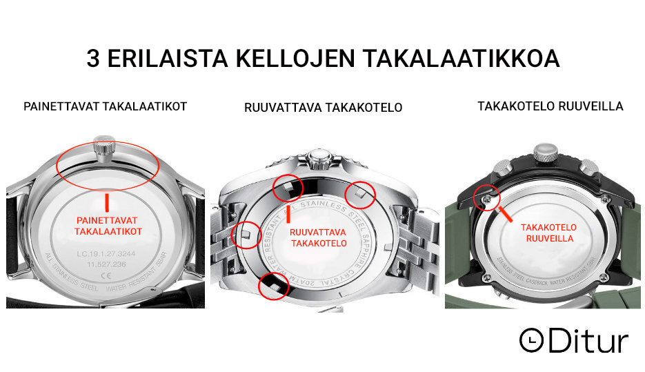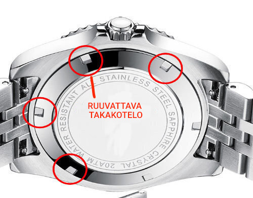 Painettavat takalaatikot: Jos haluat avata tämäntyyppisen caseback, tarvitset caseback avaaja . Muissa internetissä olevissa oppaissa sanotaan, että voit yhtä hyvin käyttää litteää ruuvimeisseliä tai veistä. Emme kuitenkaan suosittele tätä, sillä veitset ja ruuvimeisselit voivat helposti aiheuttaa kelloon rumia naarmuja.